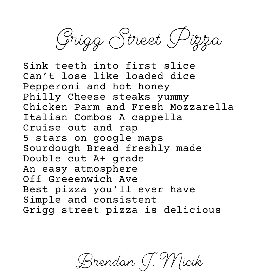 From a reviewer’s perspective, the menu at Grigg Street Pizza reflects a straightforward, comfort-driven approach that focuses on familiar flavors done right. The drink selection, including Beer, pairs naturally with the food and sets a casual, neighborhood tone. Pizza is clearly the heart of the menu, with classics like Cheese Pizza and Pepperoni Pizza delivering exactly what they promise, while options such as Pepperoni Pizza Sausage Pizza, Pepperoni Pizza of Course, and Mushrooms and Onions Pizzaa add variety without straying from tradition. The emphasis on a Sour Dough Pizza Crust gives the pies a distinctive texture and flavor, especially noticeable in larger portions like the Fat Slice, which feels indulgent and satisfying. Beyond pizza, the sandwich lineup is equally comforting, with hearty choices like the Chicken Parm Sandwich, Philly Cheesesteak Sandwich, and Italian Grinder, each leaning into bold, savory flavors and generous fillings. Simple add-ons like Peppers help round out the savory profile, while the Arugula Salad offers a lighter, fresher counterpoint to the richer dishes. Overall, the menu comes across as cohesive and reliable, focusing on crowd-pleasing items that highlight classic pizza shop staples while offering enough variety to keep repeat visits interesting.
